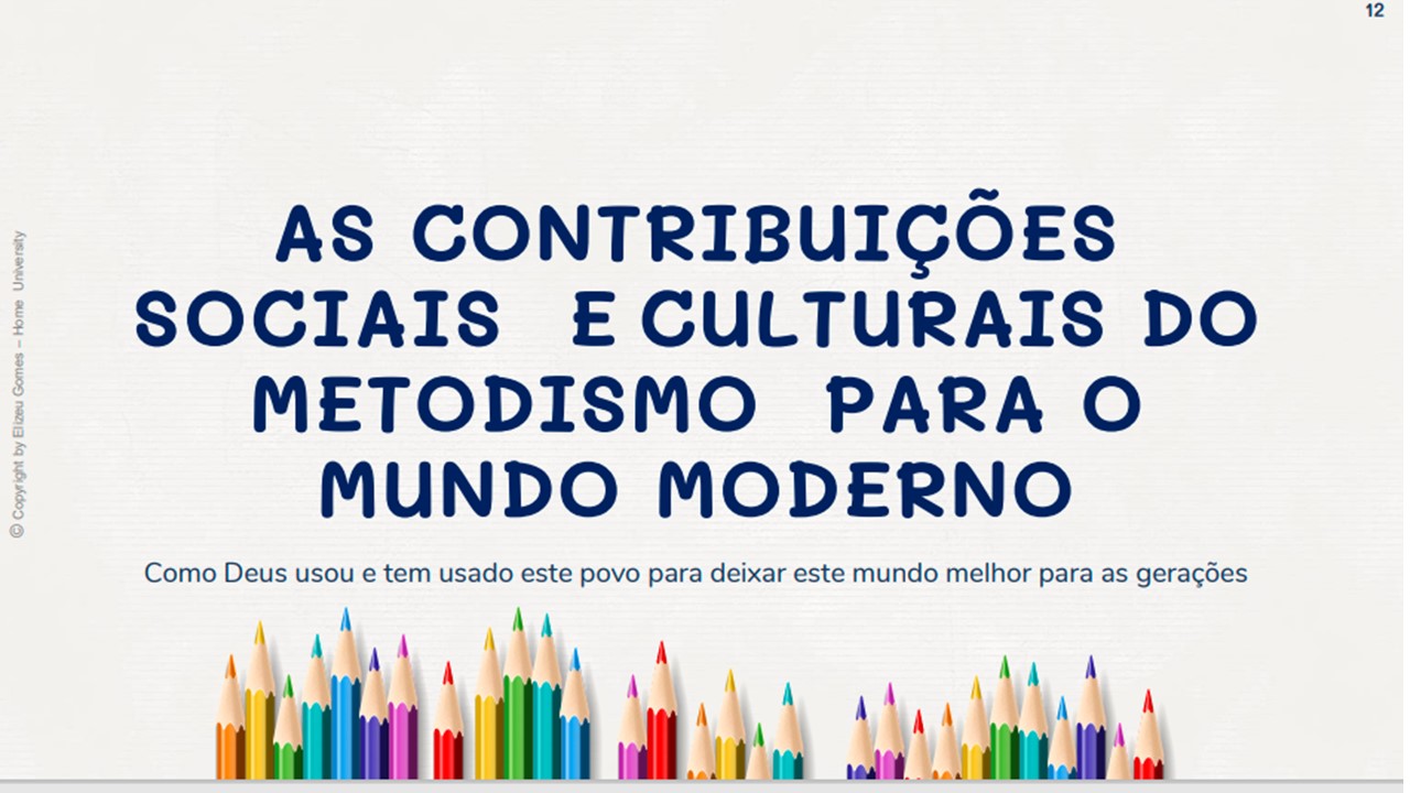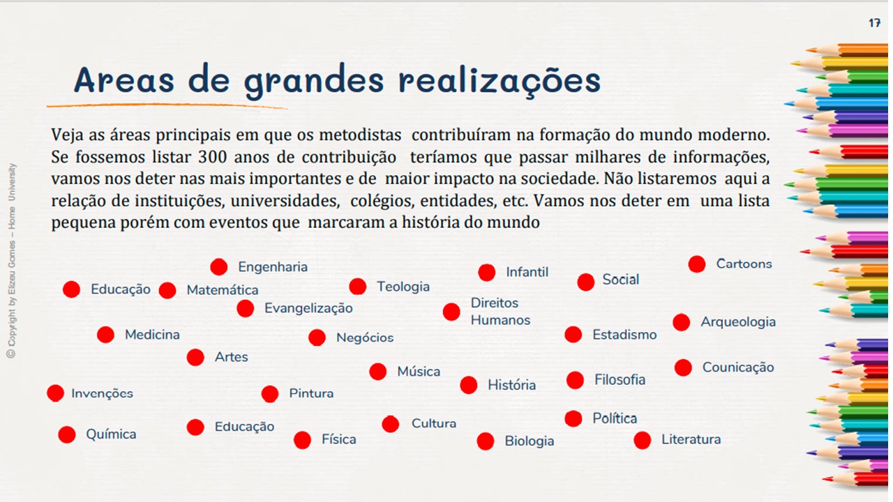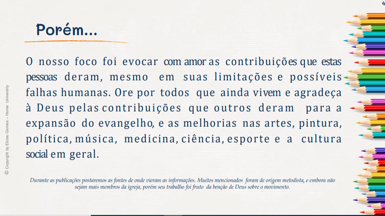 O foco aqui é evocar com amor as contribuições que estas pessoas deram, mesmo em suas limitações e possíveis falhas humanas. Ore por todos que ainda vivem e agradeça à Deus pelas contribuições que outros deram para a expansão do evangelho, e as melhorias nas artes, pintura, política, música, medicina, ciência, espor te e a cultura social em geral. Durante as publicações postaremos as fontes de onde vieram as informações. Muitos mencionados foram de origem metodista, e embora não sejam mais membros da igreja, porém seu trabalho foi fruto da benção de Deus sobre o movimento.