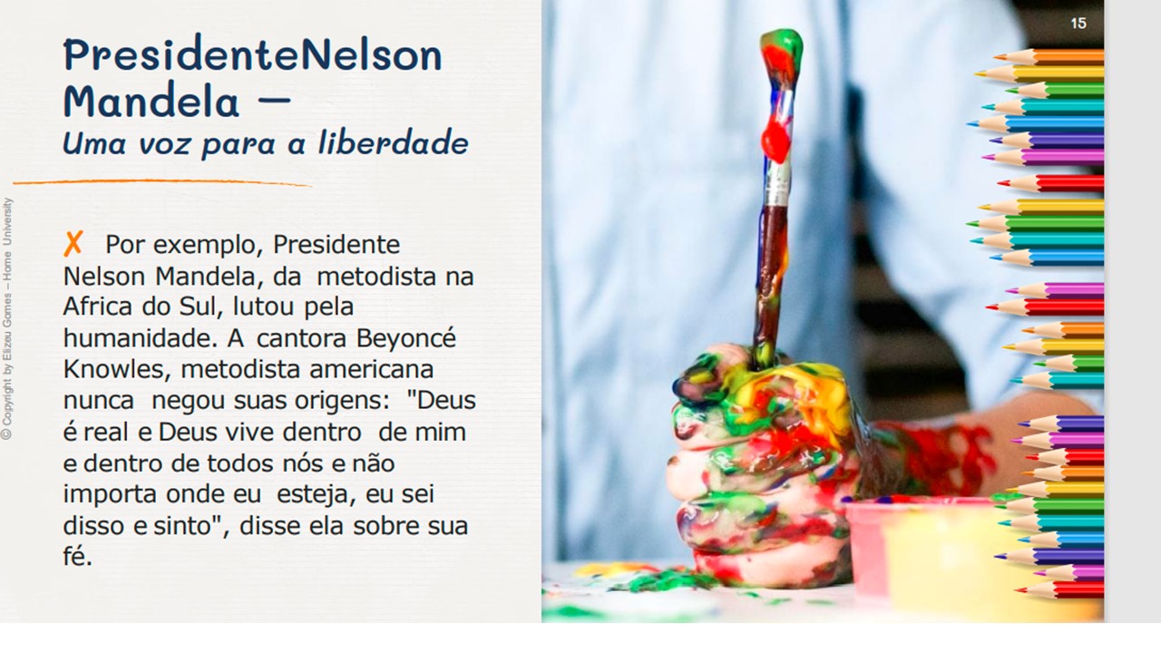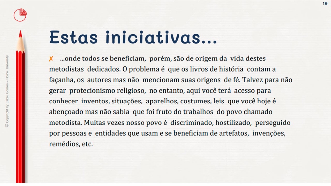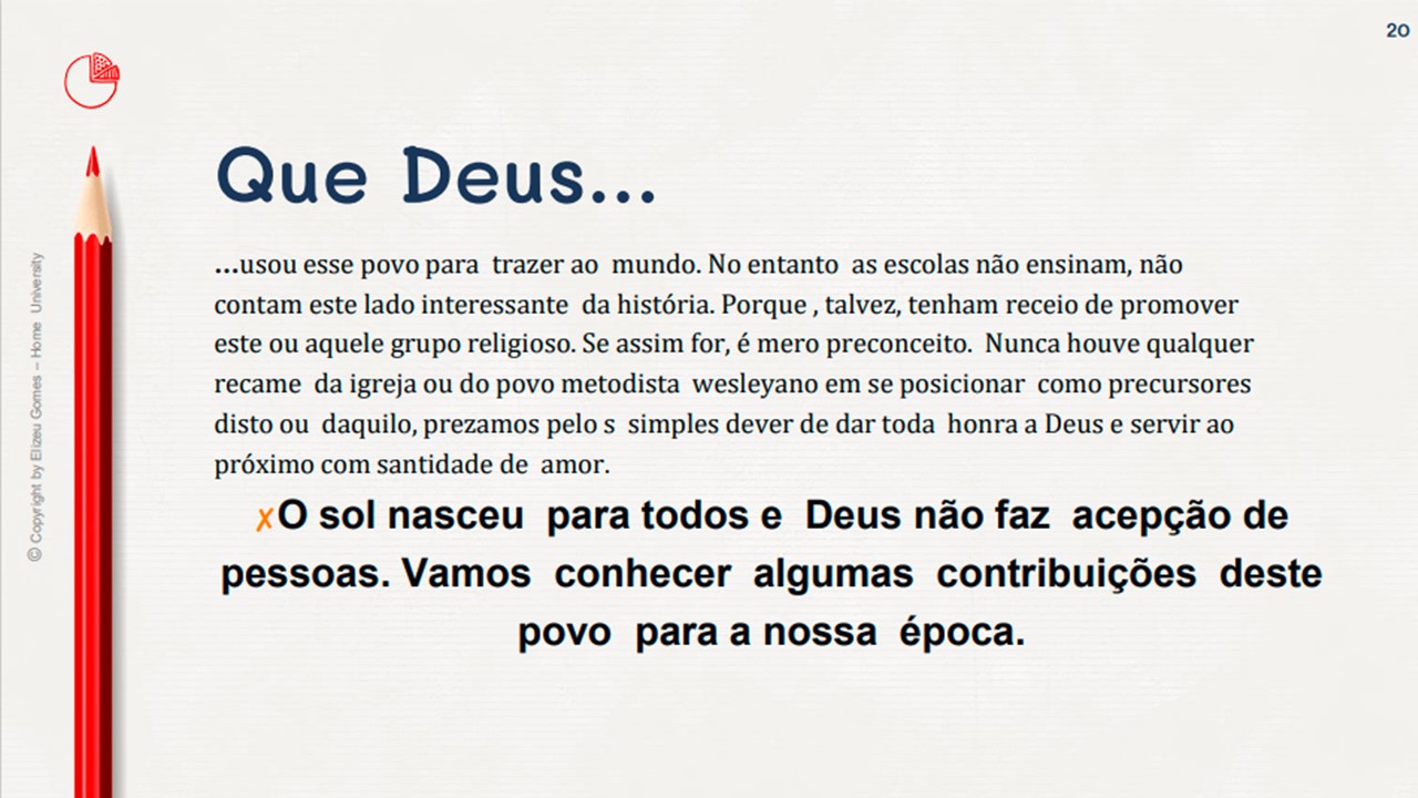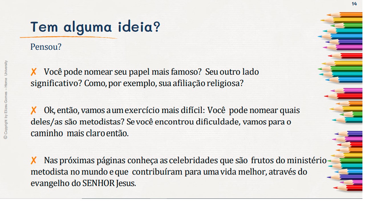 O foco aqui é evocar com amor as contribuições que estas pessoas deram, mesmo em suas limitações e possíveis falhas humanas. Ore por todos que ainda vivem e agradeça à Deus pelas contribuições que outros deram para a expansão do evangelho, e as melhorias nas artes, pintura, política, música, medicina, ciência, espor te e a cultura social em geral. Durante as publicações postaremos as fontes de onde vieram as informações. Muitos mencionados foram de origem metodista, e embora não sejam mais membros da igreja, porém seu trabalho foi fruto da benção de Deus sobre o movimento.