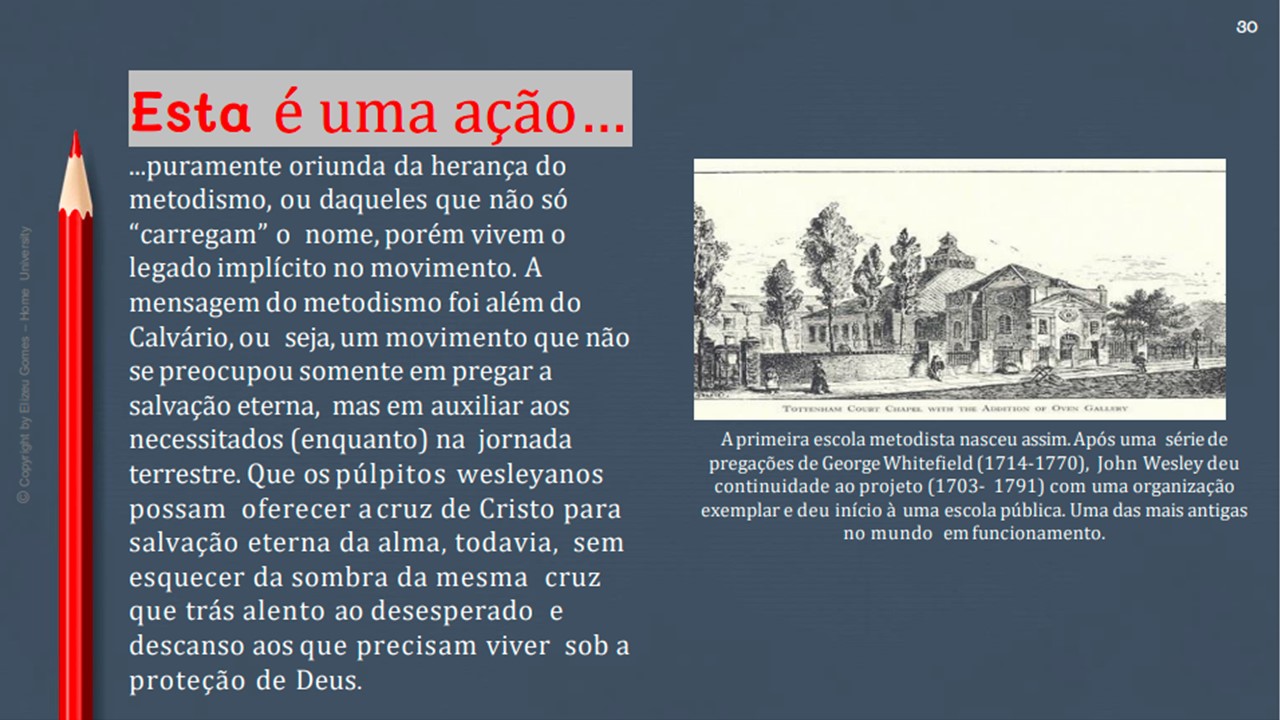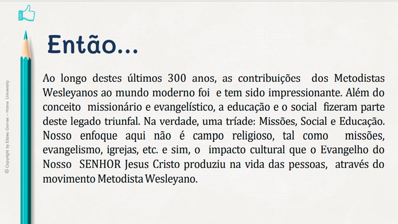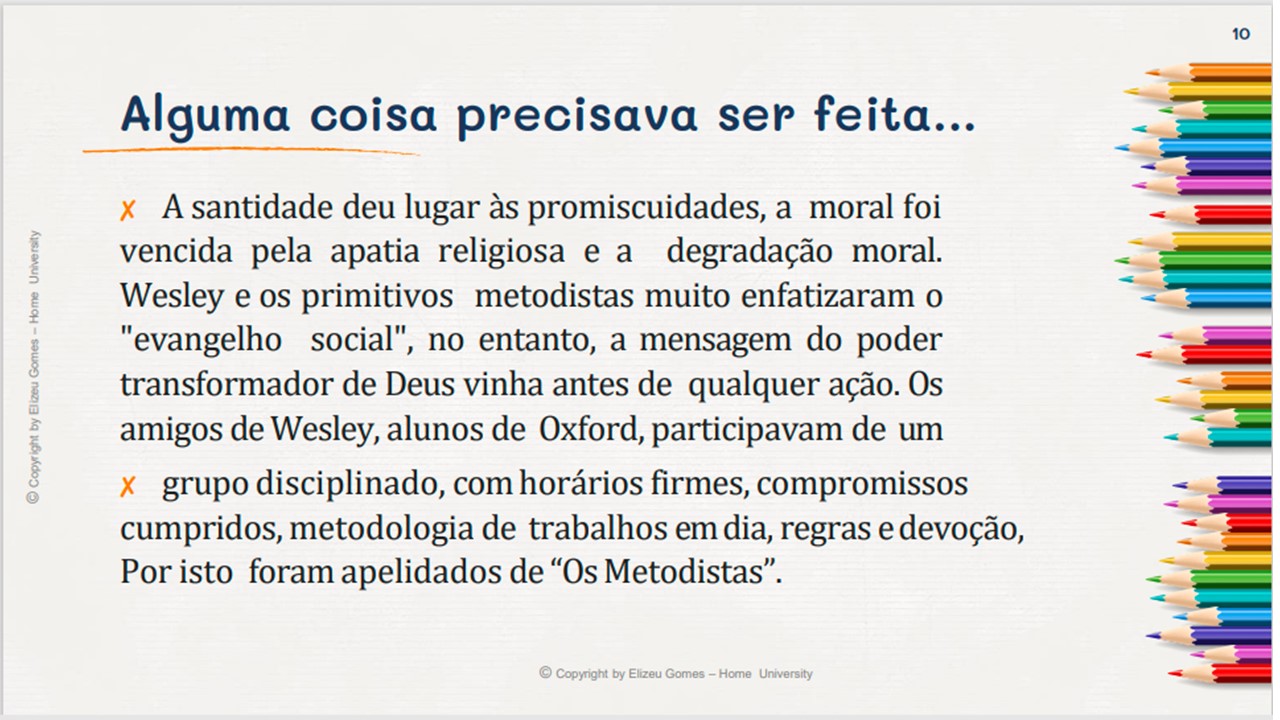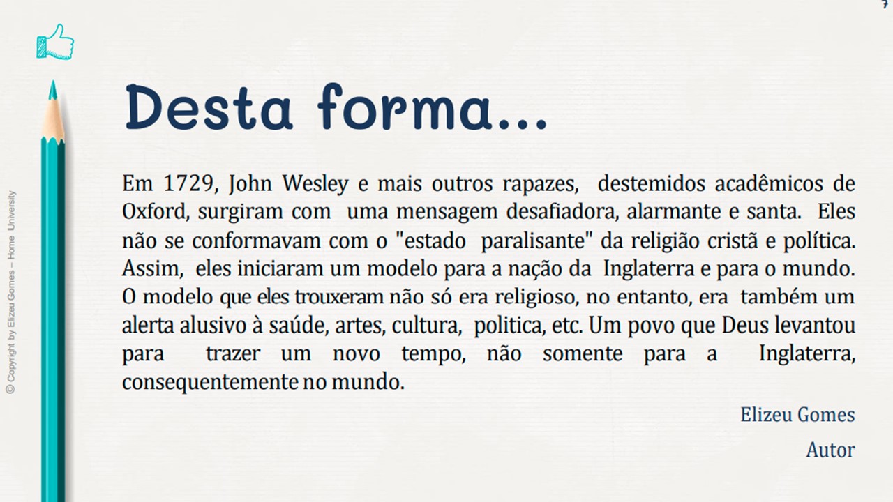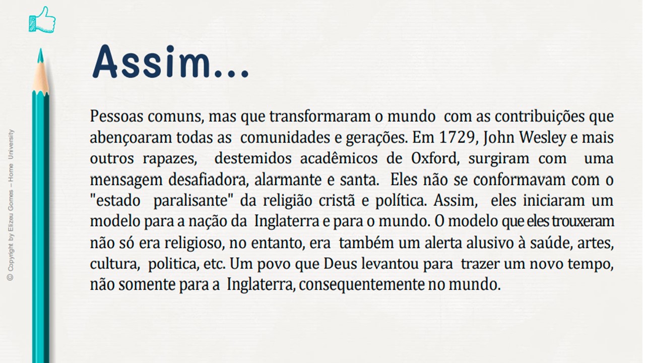 Assim... Pessoas comuns, mas que transformaram o mundo com as contribuições que abençoaram todas as comunidades e gerações. Em 1729, John Wesley e mais outros rapazes, destemidos acadêmicos de Oxford, surgiram com uma mensagem desafiadora, alarmante e santa. Eles não se conformavam com o "estado paralisante" da religião cristã e política. Assim, eles iniciaram um modelo para a nação da Inglaterra e para o mundo. O modelo queelestrouxeram não só era religioso, no entanto, era também um alerta alusivo à saúde, artes, cultura, politica, etc. Um povo que Deus levantou para trazer um novo tempo, não somente para a Inglaterra, consequentemente no mundo.