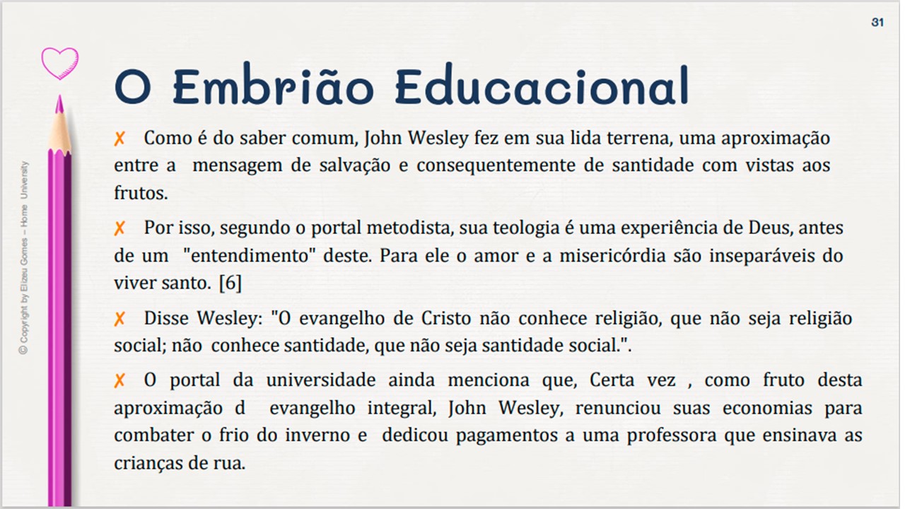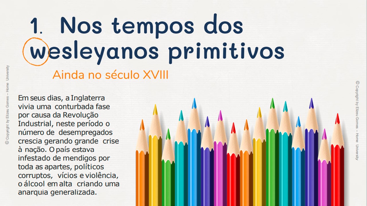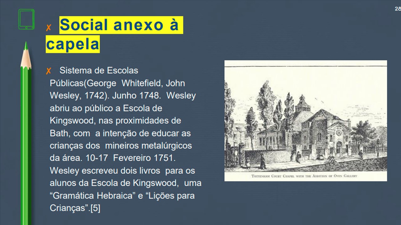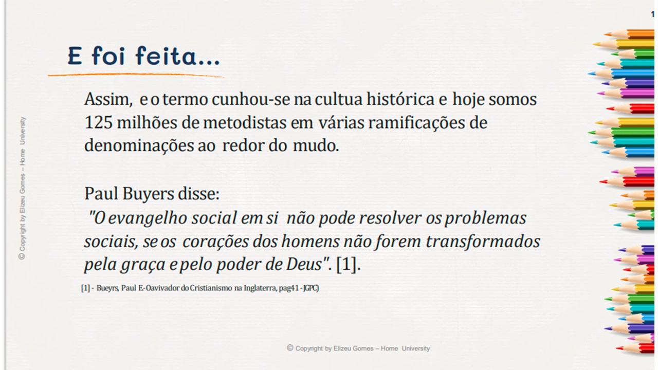 Desta forma... Em 1729, John Wesley e mais outros rapazes, destemidos acadêmicos de Oxford, surgiram com uma mensagem desafiadora, alarmante e santa. Eles não se conformavam com o "estado paralisante" da religião cristã e política. Assim, eles iniciaram um modelo para a nação da Inglaterra e para o mundo. O modelo que eles trouxeram não só era religioso, no entanto, era também um alerta alusivo à saúde, artes, cultura, politica, etc. Um povo que Deus levantou para trazer um novo tempo, não somente para a Inglaterra, consequentemente no mundo.