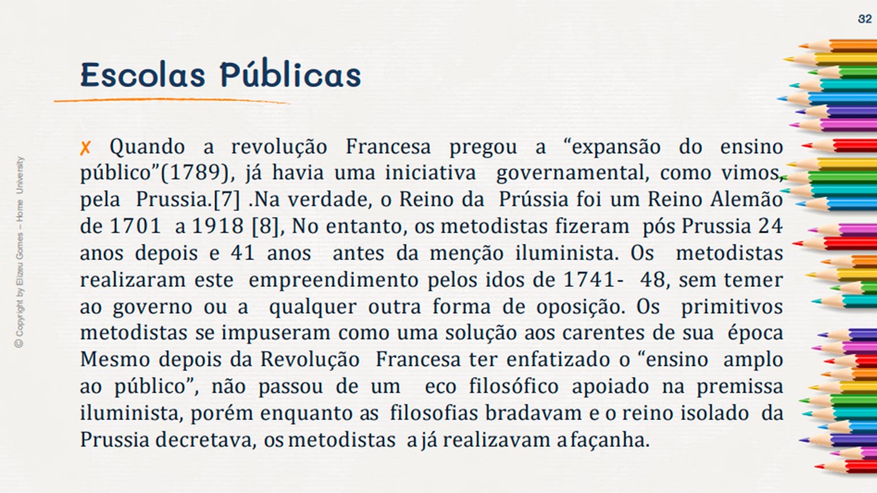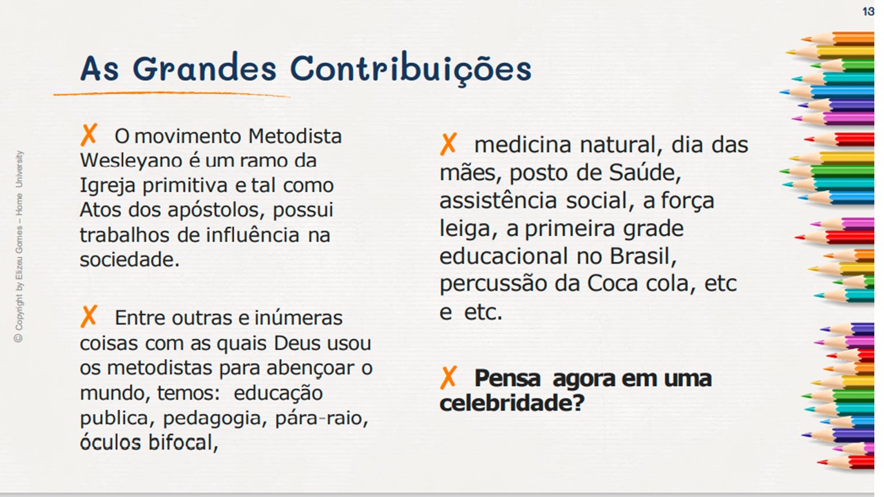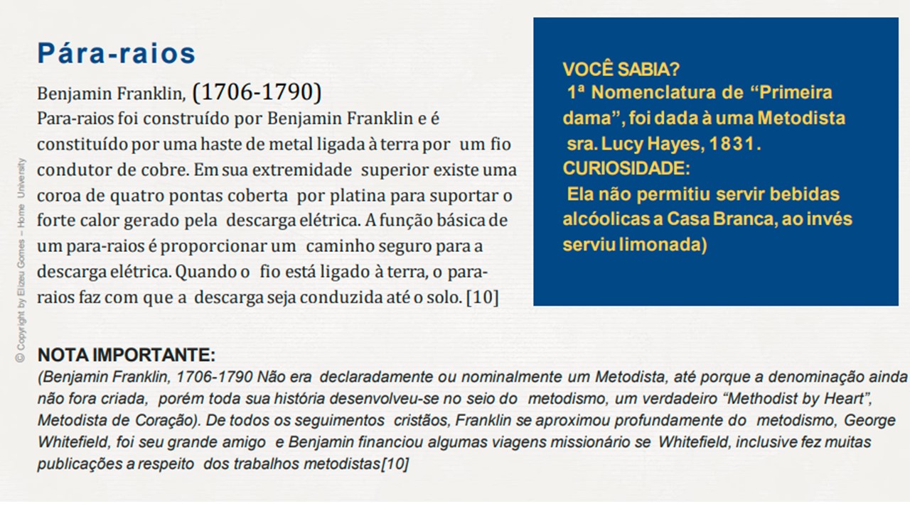 Todos municípios brasileiros e o Brasil, usufruem de muitas benecesses inventadas e criadas pelo povo wesleyano. Um povo que foi chamado por Deus, para que, além de evangelizar, também educar e transformar a humanidade.
